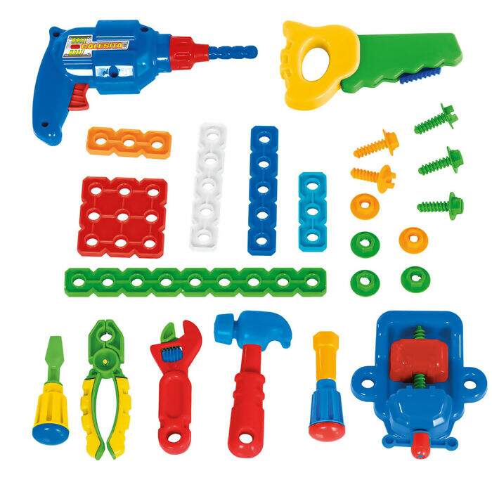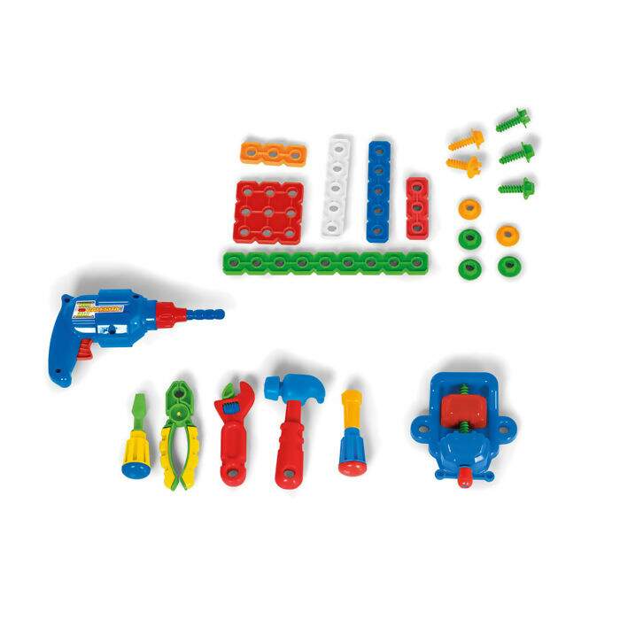 O kit vem com alicate, chave de fenda, chave de boca, chave inglesa, morsa, serrote e furadeira que fazem barulho igual aos de verdade, martelo, parafusos e porcas.