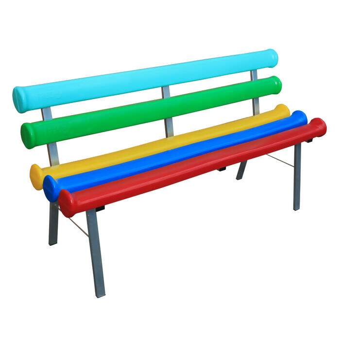 Banco com as 3 tiras do assento e as 2 do encosto em formato de toras de madeira coloridas, levemente arredondadas para maior conforto.