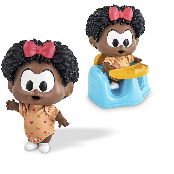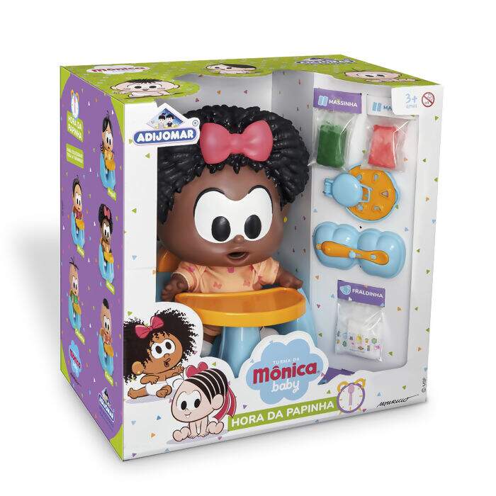 A coleção Turma da Mônica Papinha vem com cadeirinha, e Kit Papinha: 1 Prensinha, 2 Massinhas, 1 Colherzinha, 1 Potinho para armazenar as massinhas, 1 Fraldinha e 1 Cartela de Adesivos.