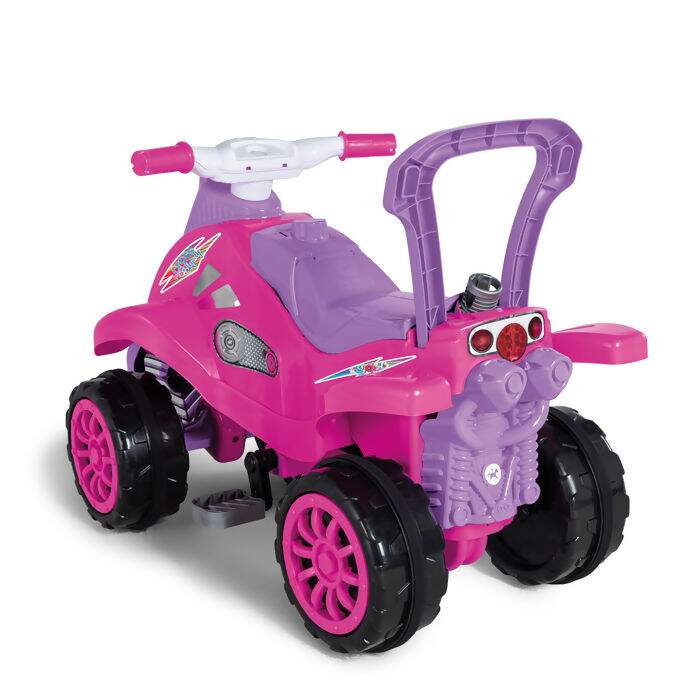 O Cross Legacy vem com rodas antiderrapantes, buzina e um assento que abre e fecha para guardar brinquedos.