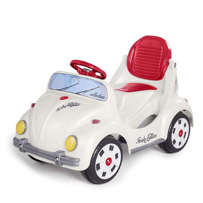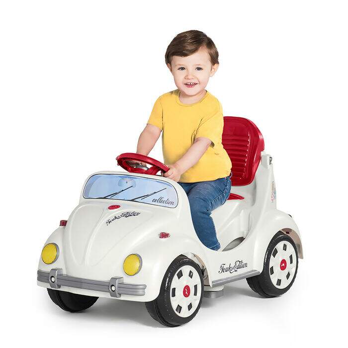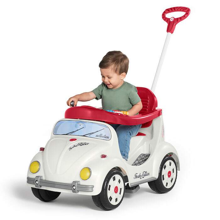 O quadriciclo é inspirado em um clássico e vem na cor lótus com detalhes encantadores na cor vermelha.