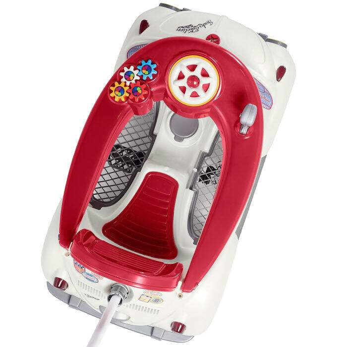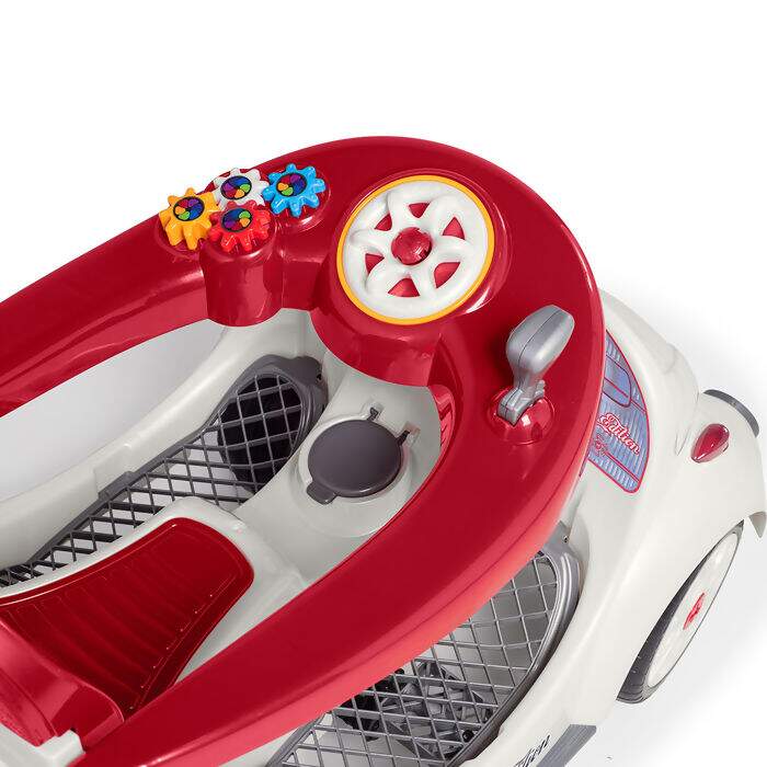 Possui aro protetor com atividades didáticas e som no volante, também vem com suporte para garrafa de água e apoio de pés para os pequeninos. As rodas são emborrachas para não derrapar.