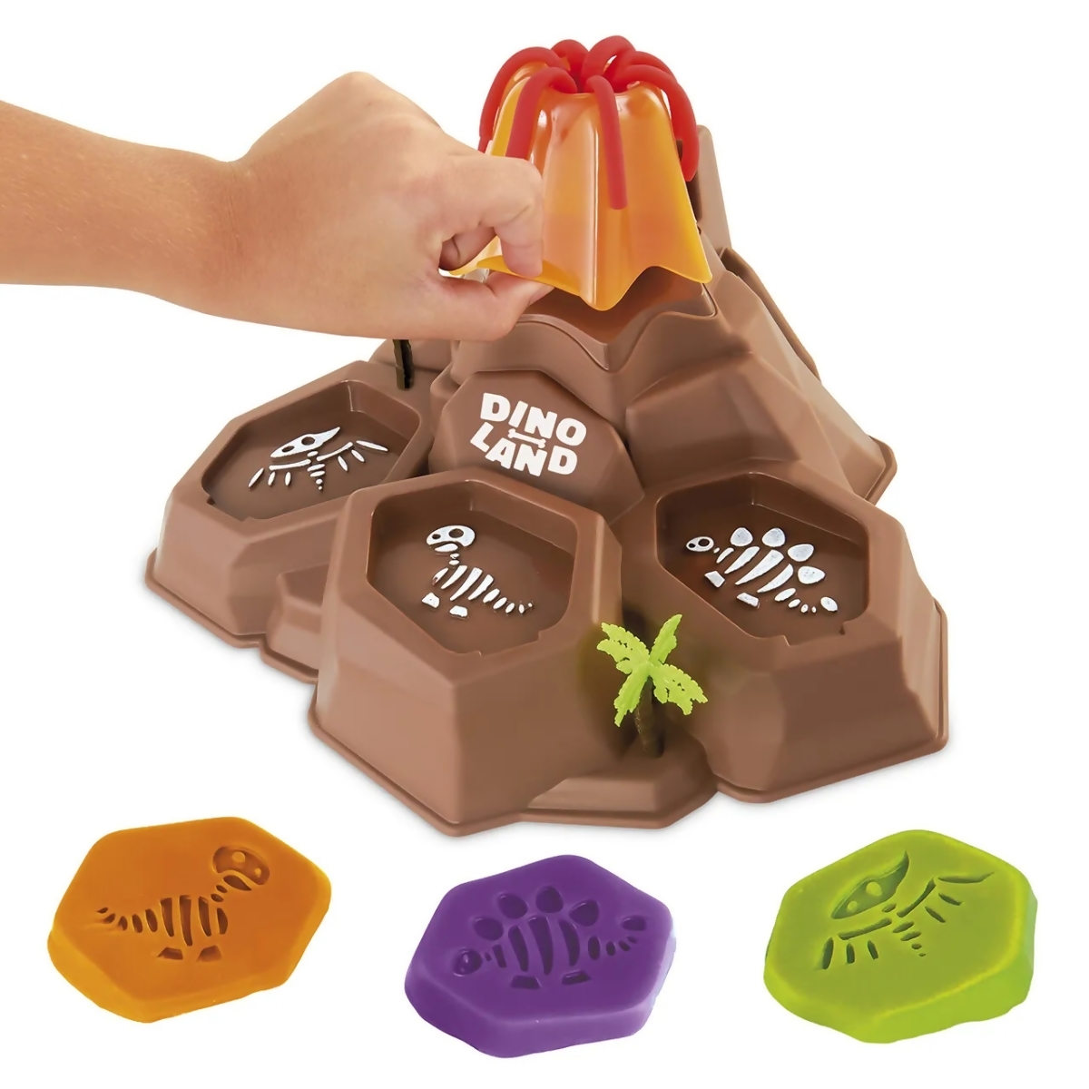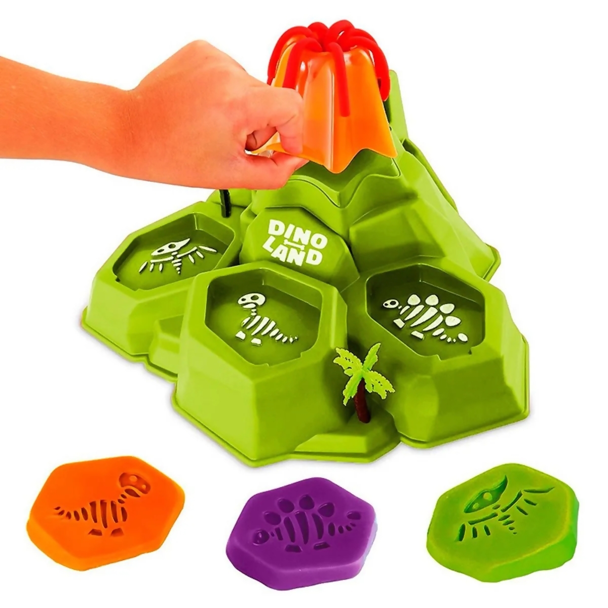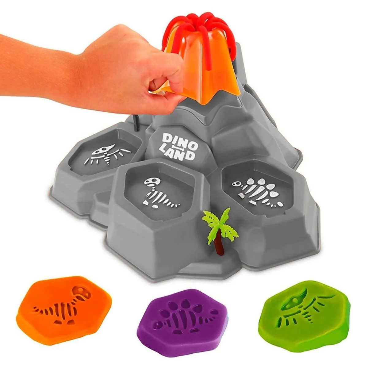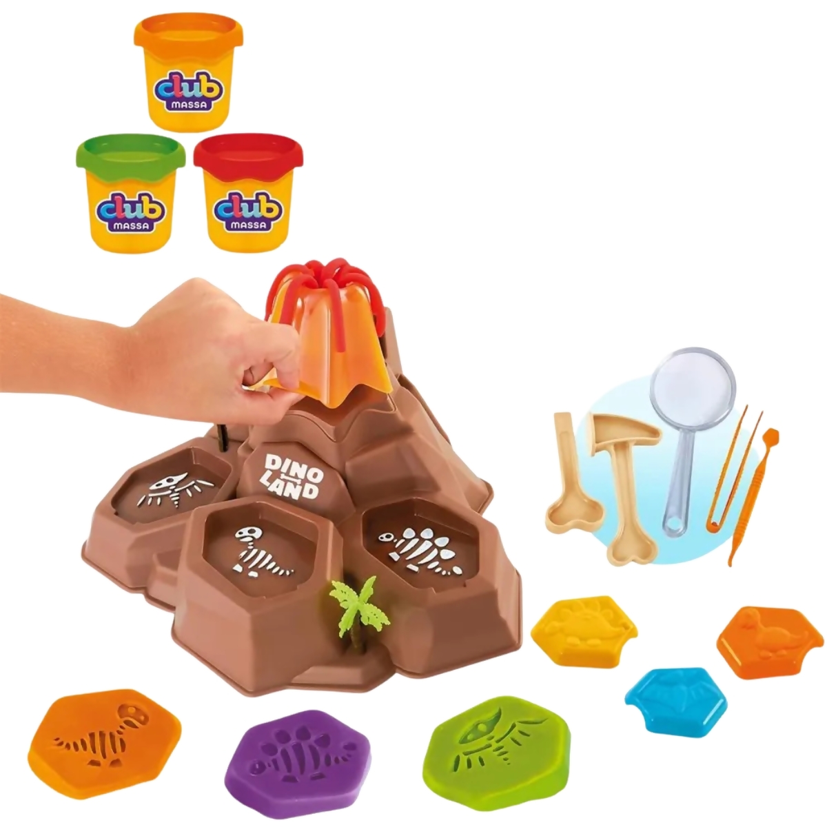 Contém: 1 Máquina de Modelagem em Forma de Vulcão Dinoland, 3 Potes de Massinha e 8 Acessórios.
