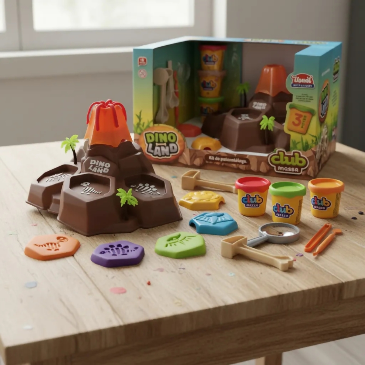 Da coleção Club Massa, da Usual Brinquedos, este conjunto traz um divertido vulcão com mecanismo que simula erupção de massinha, tornando a experiência ainda mais interativa e cheia de emoção. As crianças podem criar dinossauros, cenários pré-históricos e viver grandes aventuras enquanto modelam.