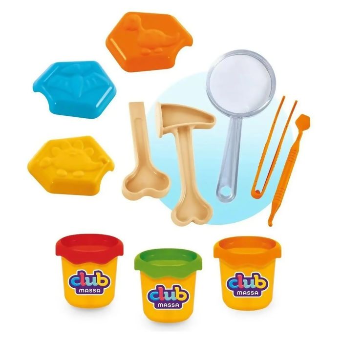 O kit acompanha 3 potes de massinha colorida, macia e fácil de modelar, além de acessórios especiais que ajudam a dar forma aos dinossauros e deixar a brincadeira ainda mais completa.