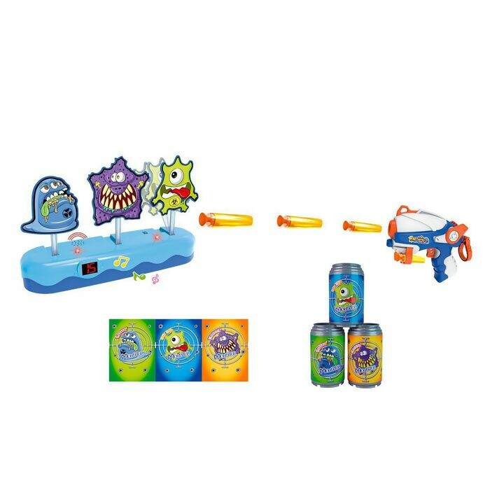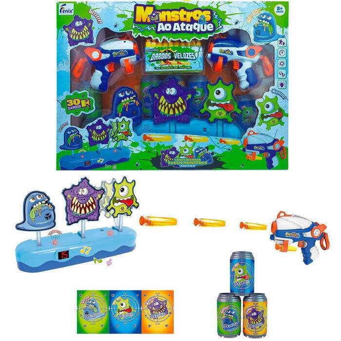 Acerte ao alvo com o Lançador de Dardos Fênix Monstros ao Ataque. Você pode atacar os monstros e as latinhas com os dardos velozes. Teste sua mira e destreza na hora de competir com os amigos no placar eletrônico, quem acertar mais ganha. Um brinquedo divertido e um perfeito passatempo para as crianças.