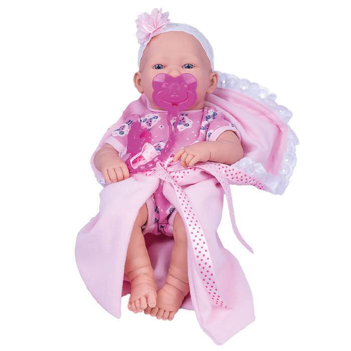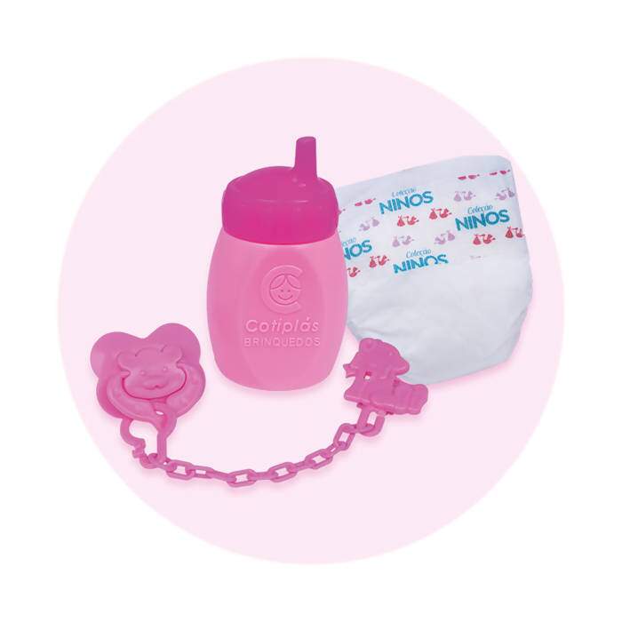 Além da boneca, vem como acessório uma linda mantinha, mamadeira, fraldinha e chupeta para você cuidar do seu bebê.