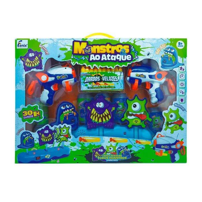 Acerte ao alvo com o Lançador de Dardos Fênix Monstros ao Ataque. Você pode atacar os monstros e as latinhas com os dardos velozes. Teste sua mira e destreza na hora de competir com os amigos no placar eletrônico, quem acertar mais ganha. Um brinquedo divertido e um perfeito passatempo para as crianças.