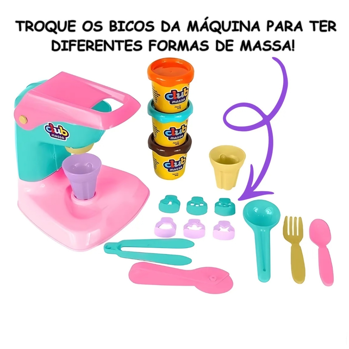 Basta trocar os bicos da máquina para criar novos formatos de massinha e usar os acessórios e moldes para adicionar detalhes às modelagens.