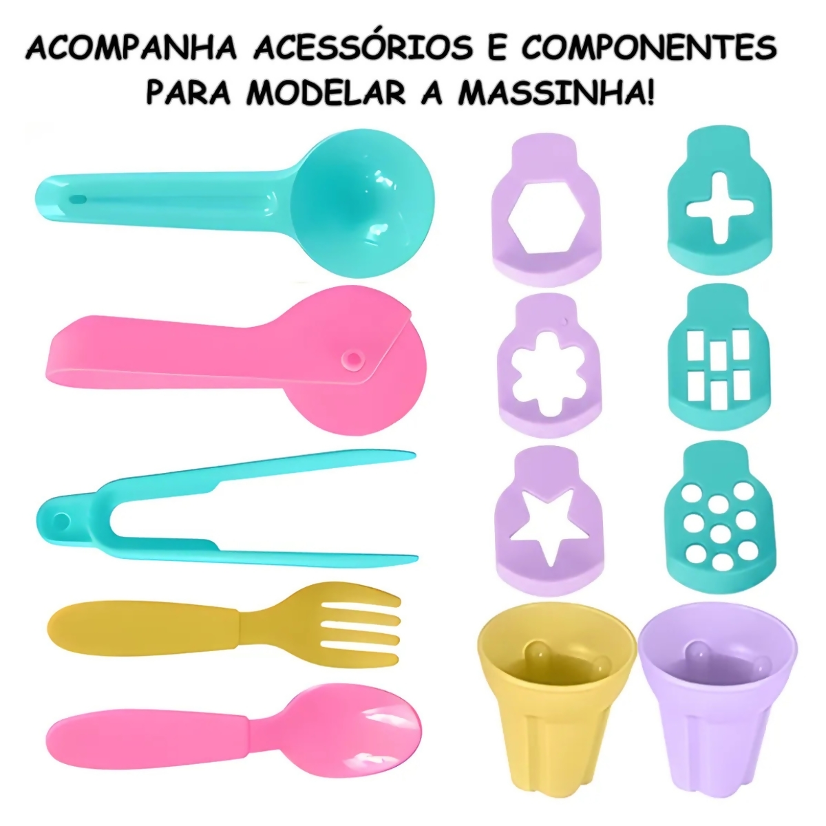 Contém: 1 Máquina de formas para massinha, Bicos intercambiáveis, Acessórios e moldes para modelagem e 3 potes de massinha colorida.