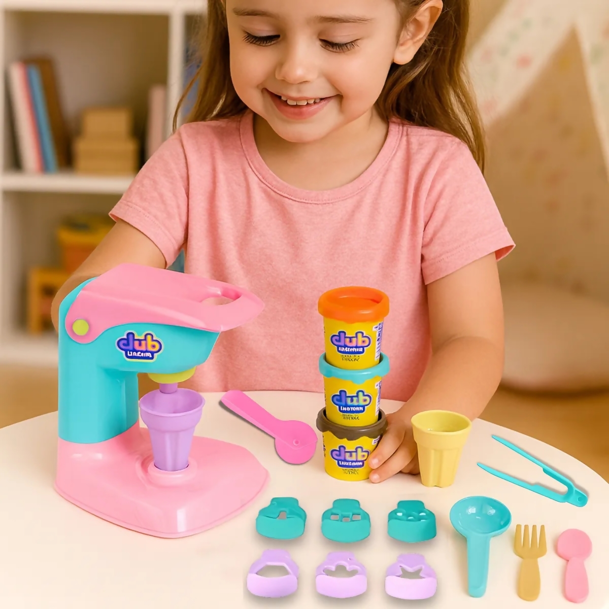Um brinquedo criativo que permite às crianças criar lindos sorvetes e diferentes formas usando massinha de modelar.