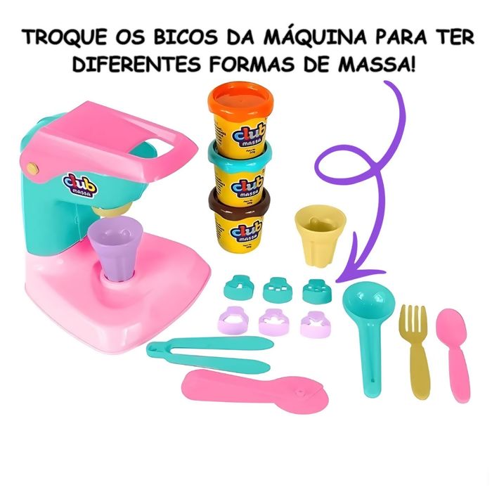 Com uma máquina de formas, bicos intercambiáveis e acessórios, os pequenos podem montar diversas criações, explorando texturas e formatos enquanto soltam a imaginação.