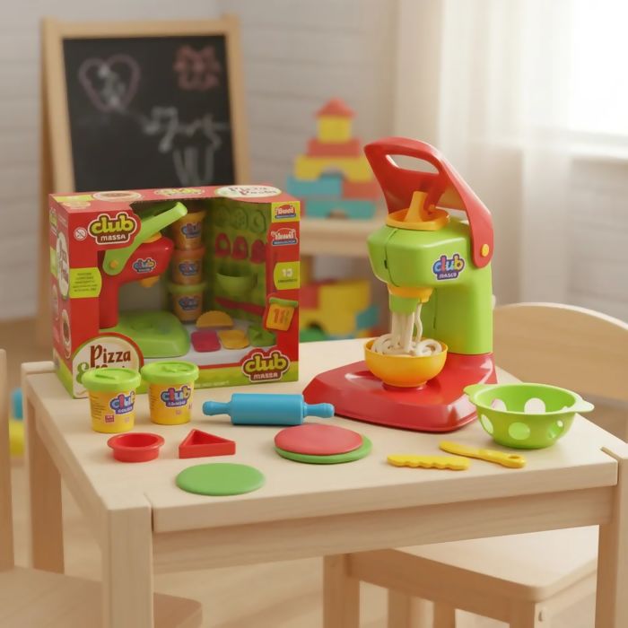 Um brinquedo criativo que permite às crianças criarem deliciosas pizzas e diferentes tipos de massas usando massinha de modelar.