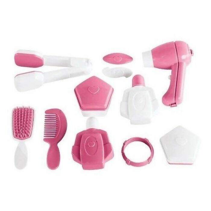 Contém: 1 Penteadeira, 2 Abas Laterais, 1 Porta-Retrato, 1 Prancha, 1 Secador, 1 Escova, 1 Pente, 2 Presilhas, 1 Pulseira, 2 Frascos com Tampa e 2 Porta Jóias com Tampa