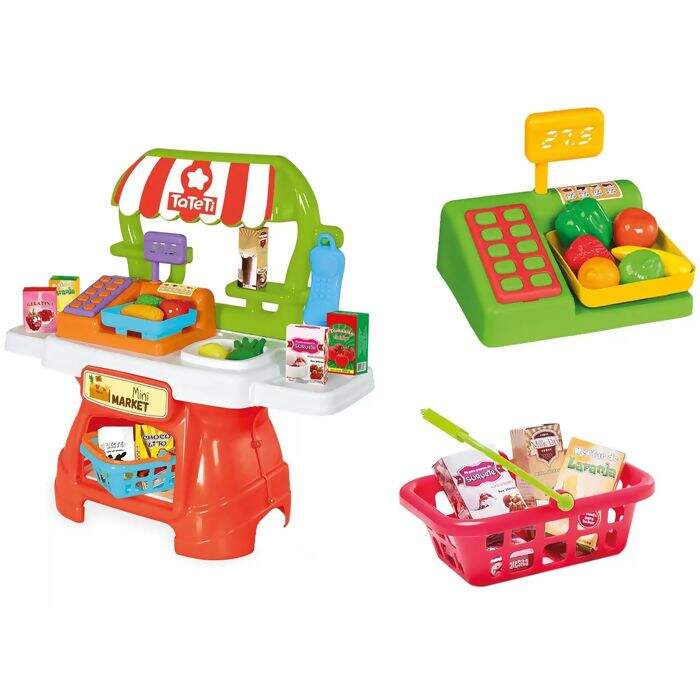O mercadinho é uma vendinha completa para brincar com os amigos (as). A venda além das frutas e verduras, tem também leite, gelatina, suco e até molho de tomate. É só escolher, colocar dentro da cestinha e e pesar tudo no caixa. Ah, só não pode esquecer de pesar as frutas e verduras na balança. Brincadeira do faz de conta que estimula o conhecimento geral através do aprendizado pela imitação.
