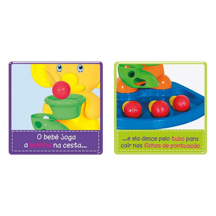 Além de ser lúdico, possuindo a forma de um elefante e todo colorido, estimula a coordenação motora e a imaginação da criança com o basquete.