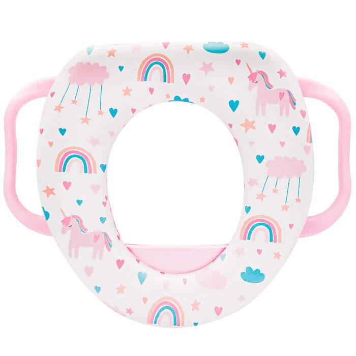 As meninas vão amar aprender a usar o vaso sanitário com esse Redutor Especial para Meninas cheio de Arco Íris, Unicórnios, Nuvens e Corações.
