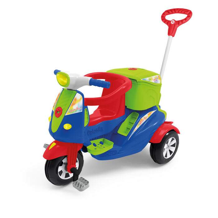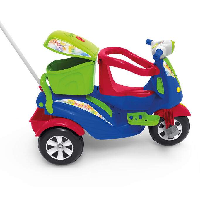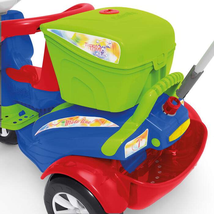 A Moto Uno é um triciclo dois em um, para passear ou pedalar. Vem com bauzinho para guardar brinquedos, farol que acende e som divertido para estimular a imaginação.